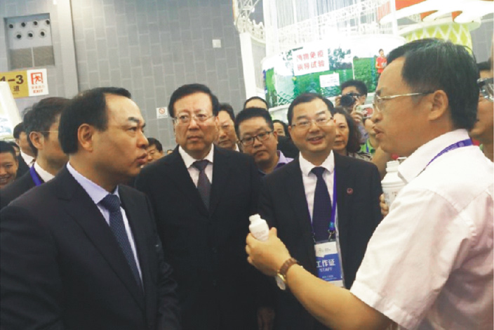 成都市農(nóng)委總農(nóng)藝師姚光貴向成都市委唐書記介紹可以喝的太抗生物農(nóng)藥(2016年創(chuàng)交會(huì))