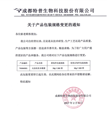 本著精益求精的工匠精神,以提高客戶滿意度為宗旨,同時根據(jù)市場需求、客戶反饋以及公司的發(fā)展需求,2月8日,公司給市場上各位新老客戶發(fā)出了關于太抗?哈茨木霉菌包裝變更的通知,公司生產(chǎn)部的同事們也正加班加點生產(chǎn),希望趕在春播前把產(chǎn)品配送到各位客戶朋友手上!