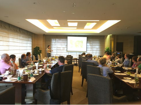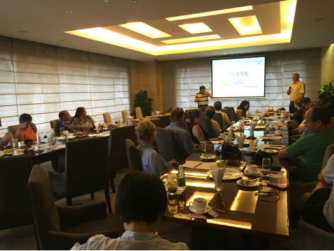 會(huì)上,董事長(zhǎng)黃永博士詳細(xì)講解了太抗系列產(chǎn)品的作用機(jī)理及各地應(yīng)用案列,得到了所有與會(huì)人員的高度關(guān)注。當(dāng)講到太抗產(chǎn)品的安全性時(shí),外賓們紛紛將在燒杯中的樣品看了又看,聞了又聞,可能實(shí)在覺(jué)得看似酸奶的生物農(nóng)藥著實(shí)稀奇。PPT放映結(jié)束后,外賓們接連提問(wèn),關(guān)于產(chǎn)品的保質(zhì)期、使用技術(shù)、投入產(chǎn)出比等等,董事長(zhǎng)一一解答,連喝水的空都沒(méi)有。其中,來(lái)自來(lái)自維多利亞州的Gary Jeans講到其種植有4000公頃有機(jī)李用于出口中國(guó),非常希望能用上太抗系列產(chǎn)品!此外,有外賓提出想帶些樣品回澳洲,也有外賓提出想和我公司澳洲研發(fā)人員深入交流,更有外賓要了黃董厚厚一疊名片說(shuō)是要去澳洲幫我們做宣傳!