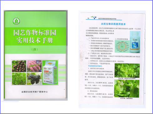 自2012年取得三證后正式推向市場以來,由于安全可靠效果好,太抗生物農(nóng)藥能夠在供給側(cè)為健康生活提供基礎(chǔ),奠立了太抗在生物農(nóng)藥行業(yè)領(lǐng)軍前行的良好格局。由于產(chǎn)品推廣示范應(yīng)用的良好效果,太抗生物農(nóng)藥入選農(nóng)業(yè)部關(guān)于印發(fā)《農(nóng)企合作共建示范基地深入推進(jìn)<到2020年農(nóng)藥用量零增長行動(dòng)實(shí)施方案計(jì)劃>實(shí)施方案》(農(nóng)農(nóng)【2015】61號(hào)),被全國農(nóng)業(yè)技術(shù)推廣服務(wù)中心編入《園藝作物標(biāo)準(zhǔn)園使用技術(shù)手冊》,也被成都市植物檢疫站編入《成都市生物農(nóng)藥應(yīng)用手冊》中第一個(gè)推薦使用的生物農(nóng)藥。